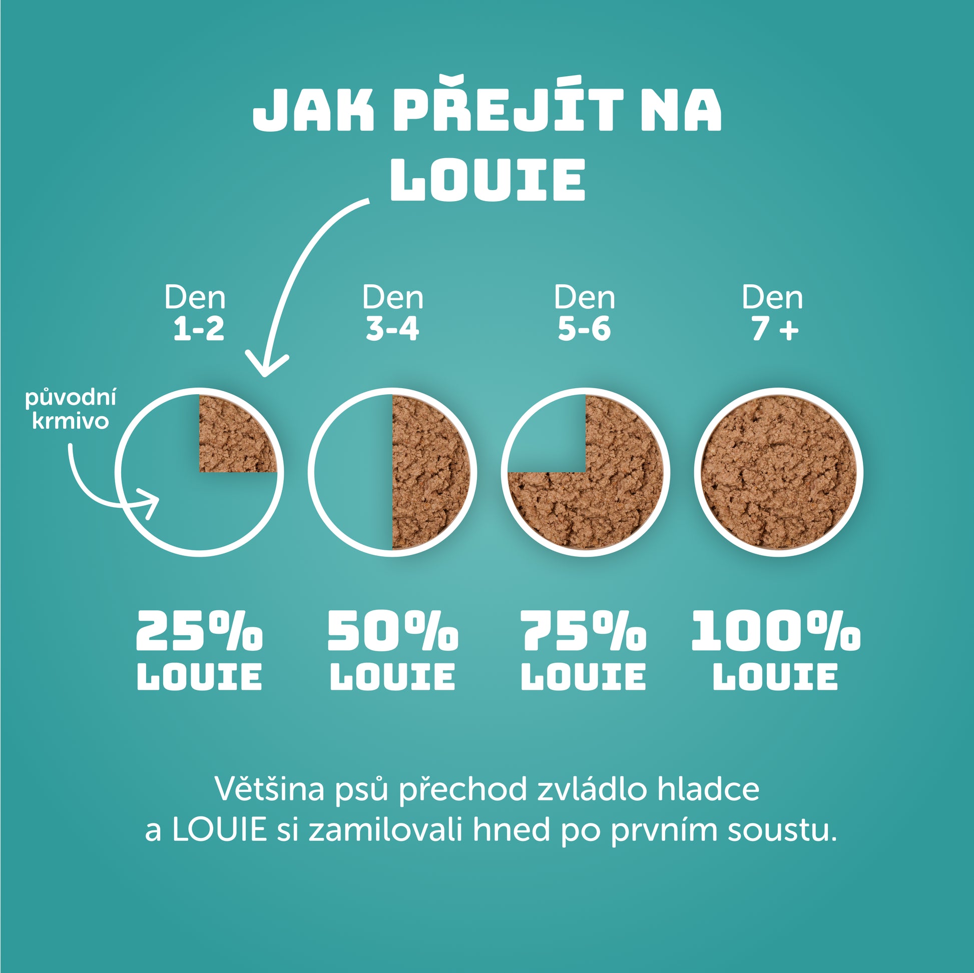 Složení konzerv LOUIE zažívacím problémům předchází, přesto je ale každý pejsek jedinečný a může se u něj objevit průjem. Pokud je zvyklý hlavně na suché krmivo, doporučujeme konzervu během prvních dnů až týdnů míchat s granulemi, na které je zvyklý. Podíl konzervy pak můžete postupně zvyšovat. Průjem může být přirozenou reakcí na změnu stravy, zejména pokud byl pes dlouhodobě krmen převážně granulemi. Ty sice představují pohodlné řešení pro majitele, ale pro psa nejsou úplně přirozené.