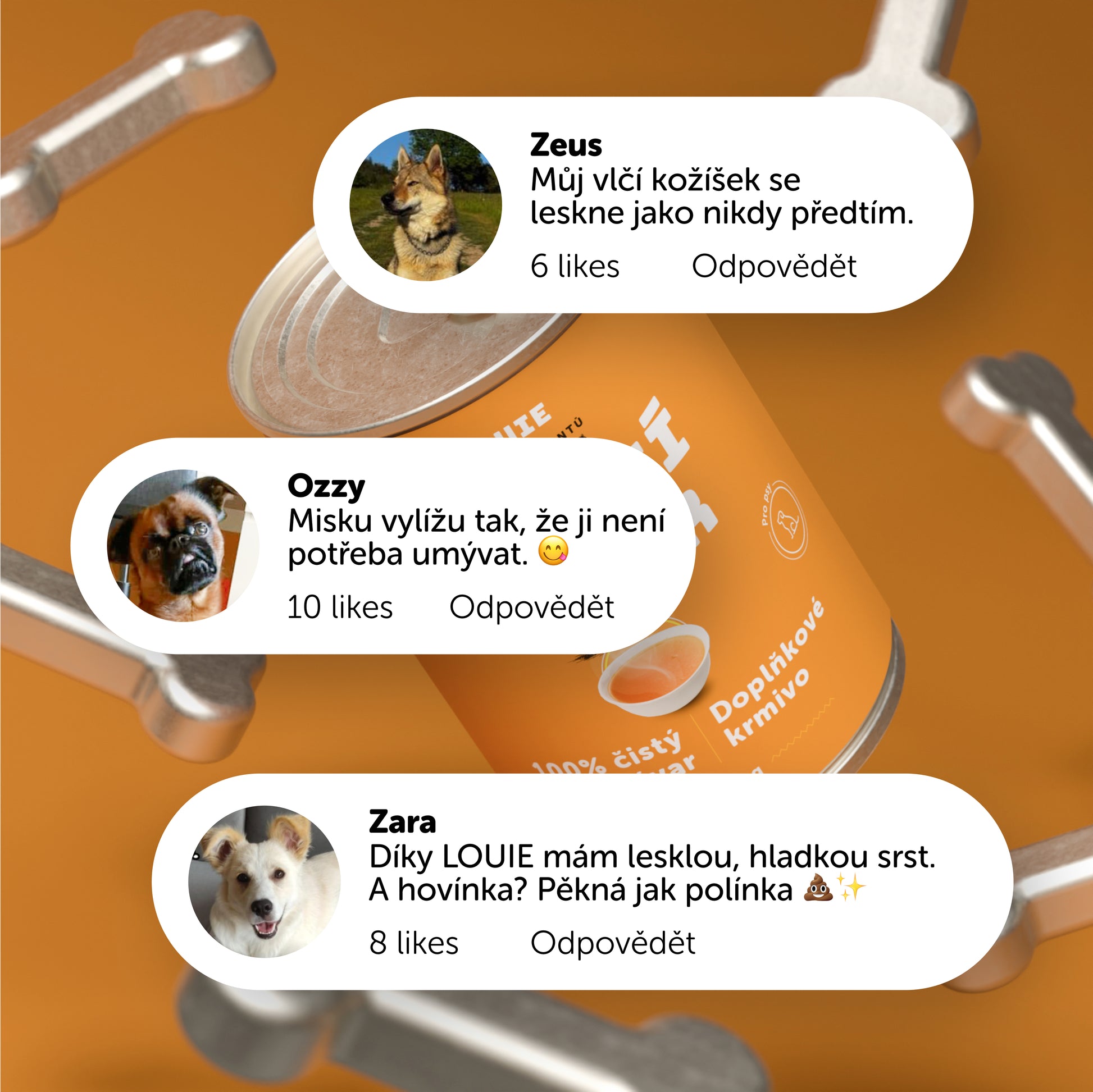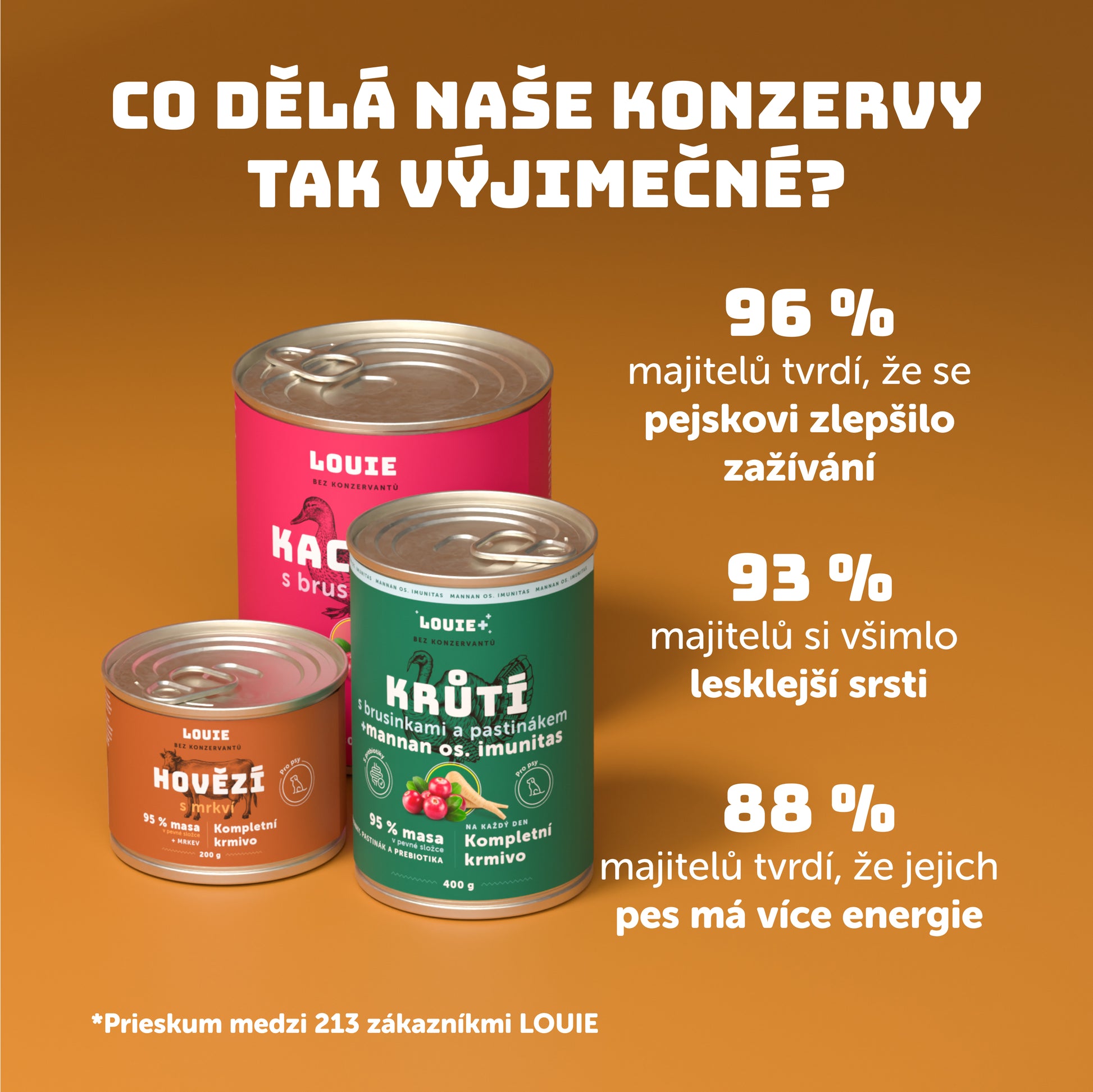 S LOUIE dávaš svému čtyřnožci vše, co potřebuje – 95 % masa v pevné složce, trochu rostlinných složek a plnou dávku živin. A ta vůně? Neodolatelná!