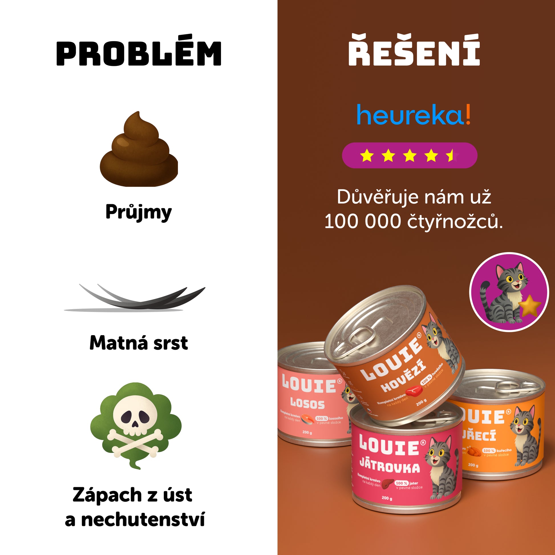 S LOUIE dávaš svému čtyřnožci vše, co potřebuje – 95 % masa v pevné složce, trochu rostlinných složek a plnou dávku živin. A ta vůně? Neodolatelná!