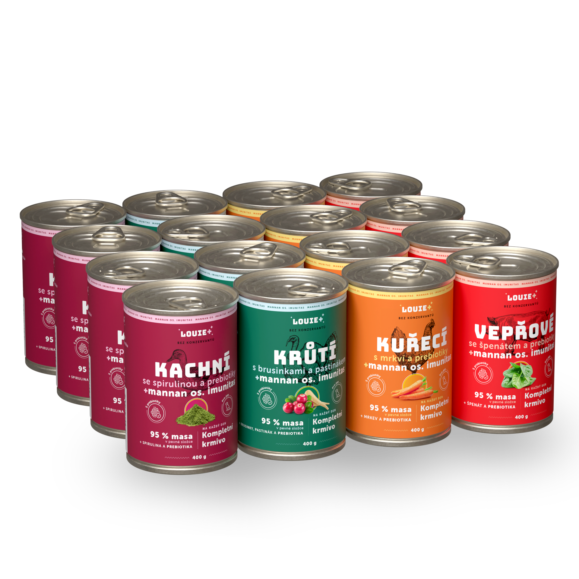 4x Kuřecí konzerva s mrkví + prebiotika 400g: Kuřecí maso, vývar, změkčené kuřecí kosti, mrkev, prebiotika (mannanoligosacharidy/fruktooligosacharidy), minerály a vitamíny. Analytické složky: hrubý protein 10,5 %, hrubý tuk 10 %, hrubý popel 1 %, hrubá vláknina 0,5 %, vlhkost 78 %. Výživová hodnota na 100 g: 156 kcal / 658 kJ. 4x Kachní konzerva se spirulinou + prebiotika 400g: Kachní maso, vývar, změkčené kachní kosti, spirulina, prebiotika (mannanoligosacharidy/fruktooligosacharidy), minerály a vitamíny. Analytické složky: hrubý protein 11 %, hrubý tuk 10 %, hrubý popel 1 %, hrubá vláknina 0,1 %, vlhkost 78 %. Výživová hodnota na 100 g: 169 kcal / 717 kJ. 4x Krůtí konzerva s brusinkami, pastinákem + prebiotika 400g: Krůtí maso, vývar, změkčené krůtí kosti, brusinky, pastinák, prebiotika (mannanoligosacharidy/fruktooligosacharidy), minerály a vitamíny. Analytické složky: hrubý protein 10,5 %, hrubý tuk 13 %, hrubý popel 1 %, hrubá vláknina 0,5 %, vlhkost 75 %. Výživová hodnota na 100 g: 166 kcal / 703 kJ. 4x Vepřové se špenátem + prebiotika 400g: Vepřové maso, vývar, špenát, prebiotika (mannanoligosacharidy/fruktooligosacharidy), minerály a vitamíny. Analytické složky: hrubý protein 12 %, hrubý tuk 18 %, hrubý popel 0,5 %, hrubá vláknina 0 %, vlhkost 68 %. Výživová hodnota na 100 g: 210 kcal / 888 kJ.