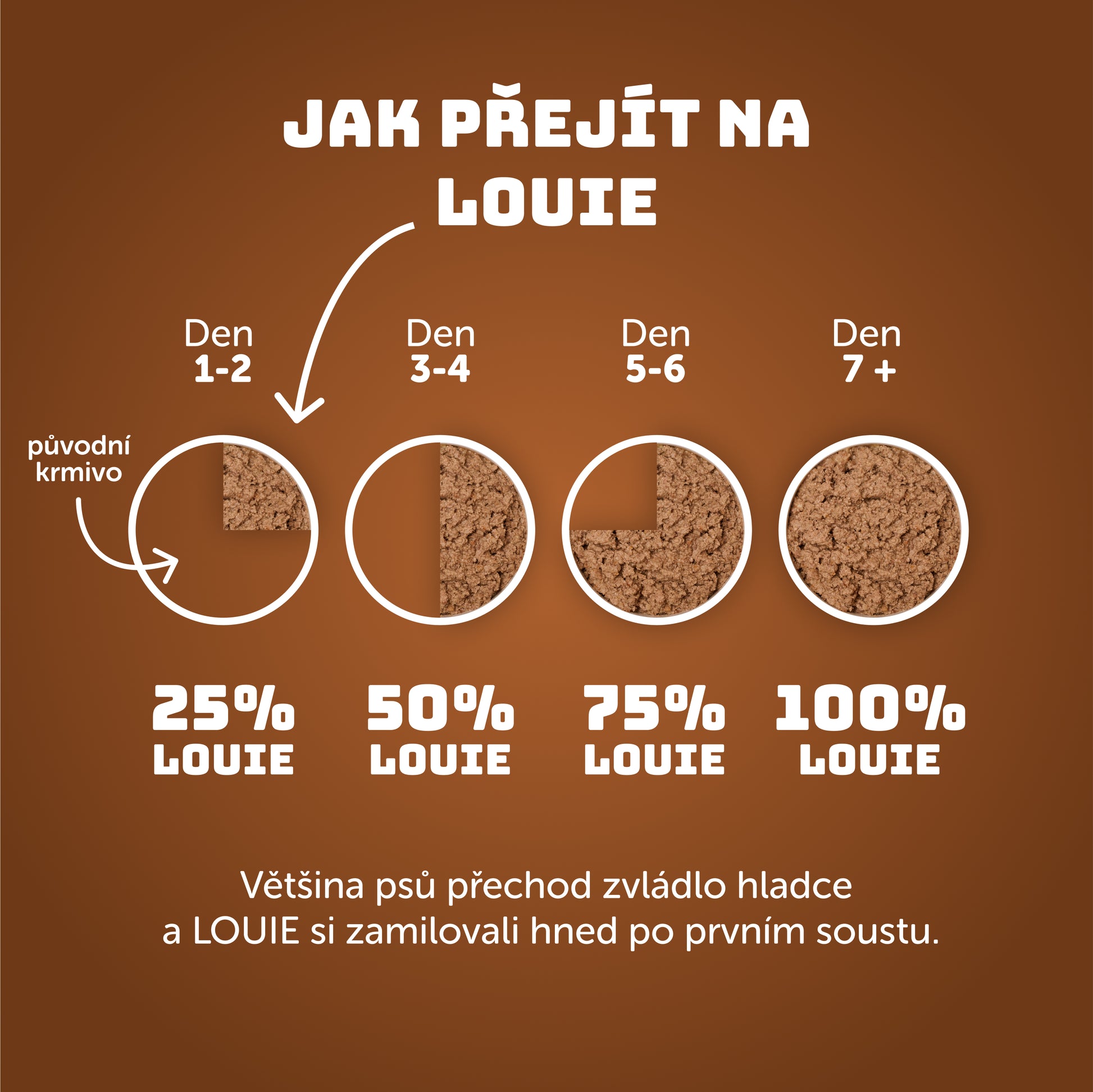 Složení konzerv LOUIE zažívacím problémům předchází, přesto je ale každý pejsek jedinečný a může se u něj objevit průjem. Pokud je zvyklý hlavně na suché krmivo, doporučujeme konzervu během prvních dnů až týdnů míchat s granulemi, na které je zvyklý. Podíl konzervy pak můžete postupně zvyšovat. Průjem může být přirozenou reakcí na změnu stravy, zejména pokud byl pes dlouhodobě krmen převážně granulemi. Ty sice představují pohodlné řešení pro majitele, ale pro psa nejsou úplně přirozené.