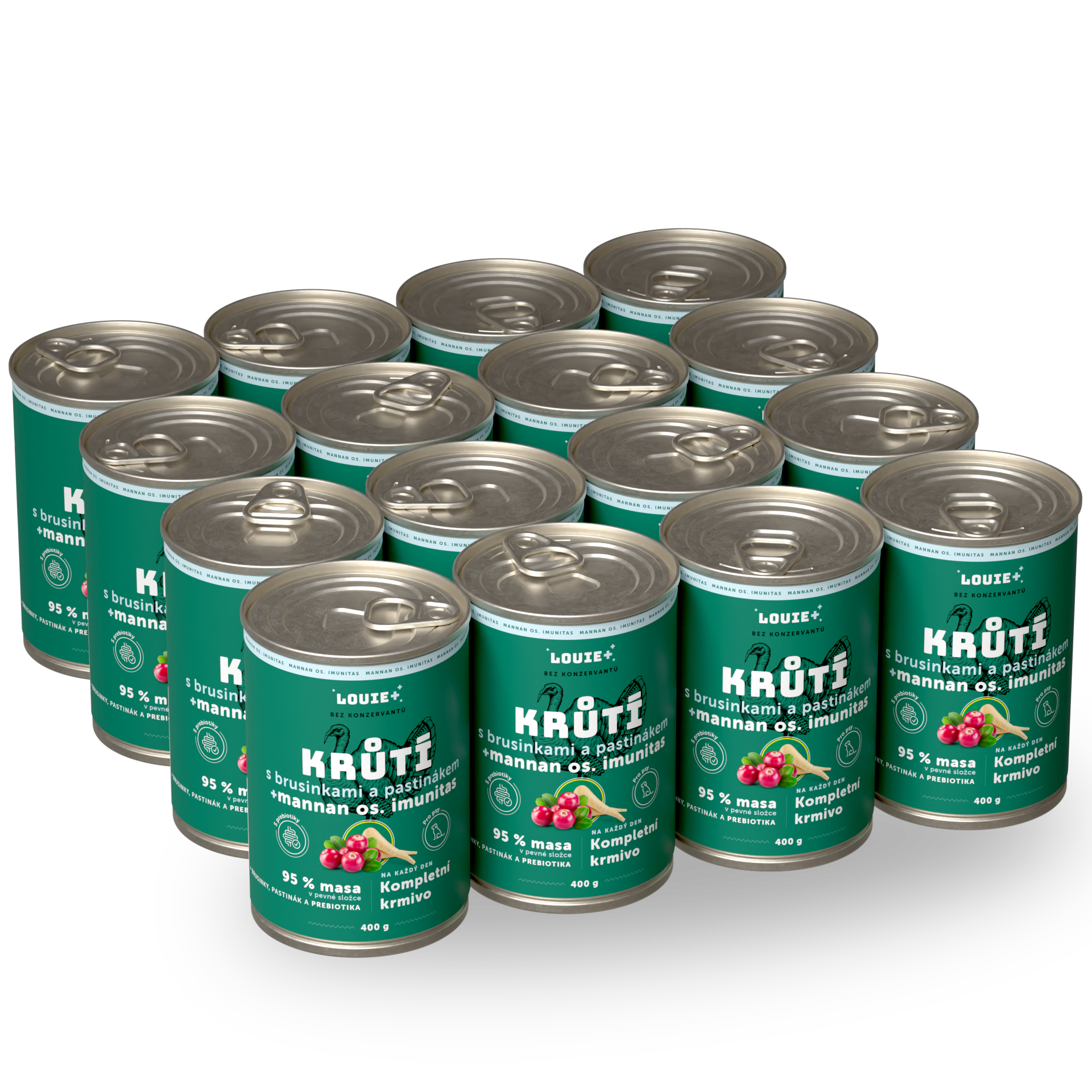 Krůtí maso, vývar, změkčené krůtí kosti, brusinky, pastinák, prebiotika (mannanoligosacharidy/fruktooligosacharidy), minerály a vitamíny. Analytické složky: hrubý protein 10,5 %, hrubý tuk 13 %, hrubý popel 1 %, hrubá vláknina 0,5 %, vlhkost 75 %.