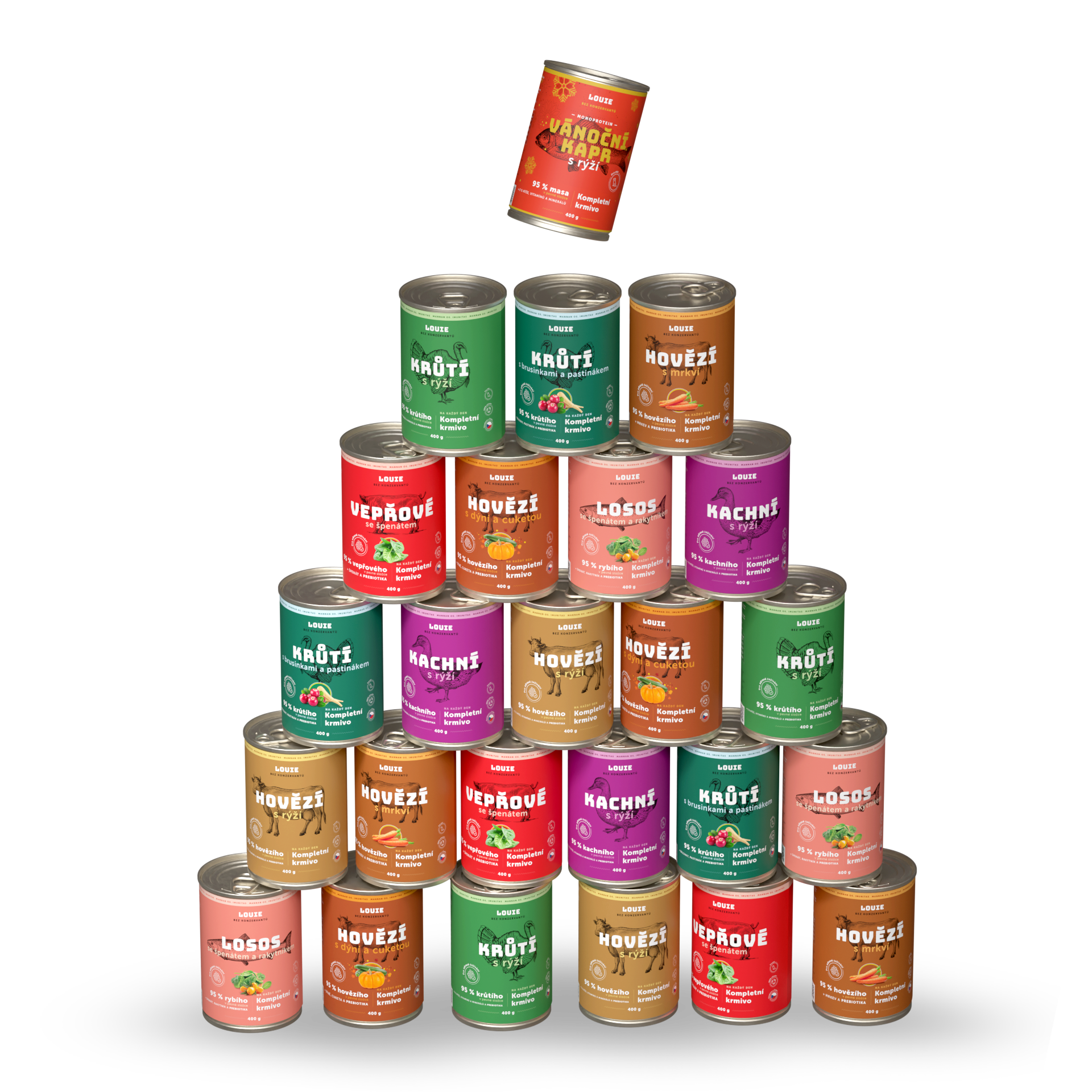 🎄 25 dní plných radosti – a kapr zdarma! Udělejte svému čtyřnohému parťákovi advent výjimečný!V balíčku najdete 25 lahodných konzerv LOUIE bez kuřecího masa, pečlivě vybraných tak, aby každý den voněl jinak – od hovězího přes krůtí až po kachní.A protože Vánoce bez kapra by nebyly Vánoce, přidali jsme speciální vánoční příchuť „Vánoční kapr“ jako dárek zdarma! 🎁 Bez obilovin, bez zbytečností, s 95 % masa a pořádnou dávkou lásky.Ideální jako adventní kalendář pro psí gurmány nebo originální vánoční dárek.