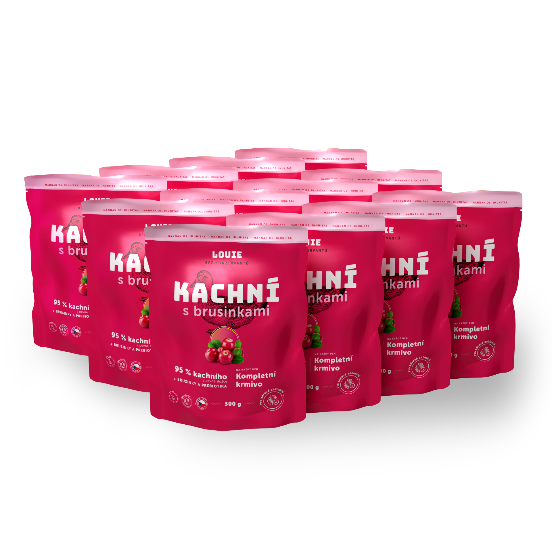 Praktická kapsička plná kompletního krmiva. Obsahuje 95 % kachního masa v pevné složce a 5 % rostlinné složky, vitamínů a minerálů. Přidané brusinky napomáhají udržení zdravé močové soustavy a podporují peristaltiku střev. A po Louie zbyde jen vylízaná miska.