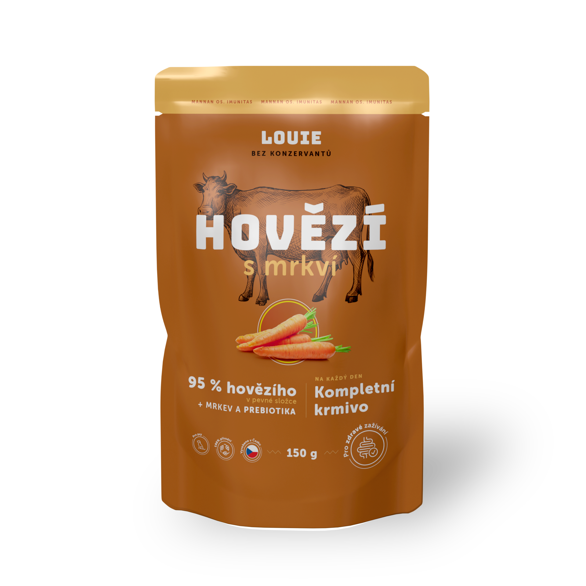 Praktická kapsička plná kompletního krmiva. Obsahuje 95 % hovězího masa v pevné složce a 5 % rostlinné složky, vitamínů a minerálů. Přidaná mrkev dodává psům potřebné živiny a minerály, takže tvůj psí parťák bude mít vše, co potřebuje pro zdravý a aktivní život.