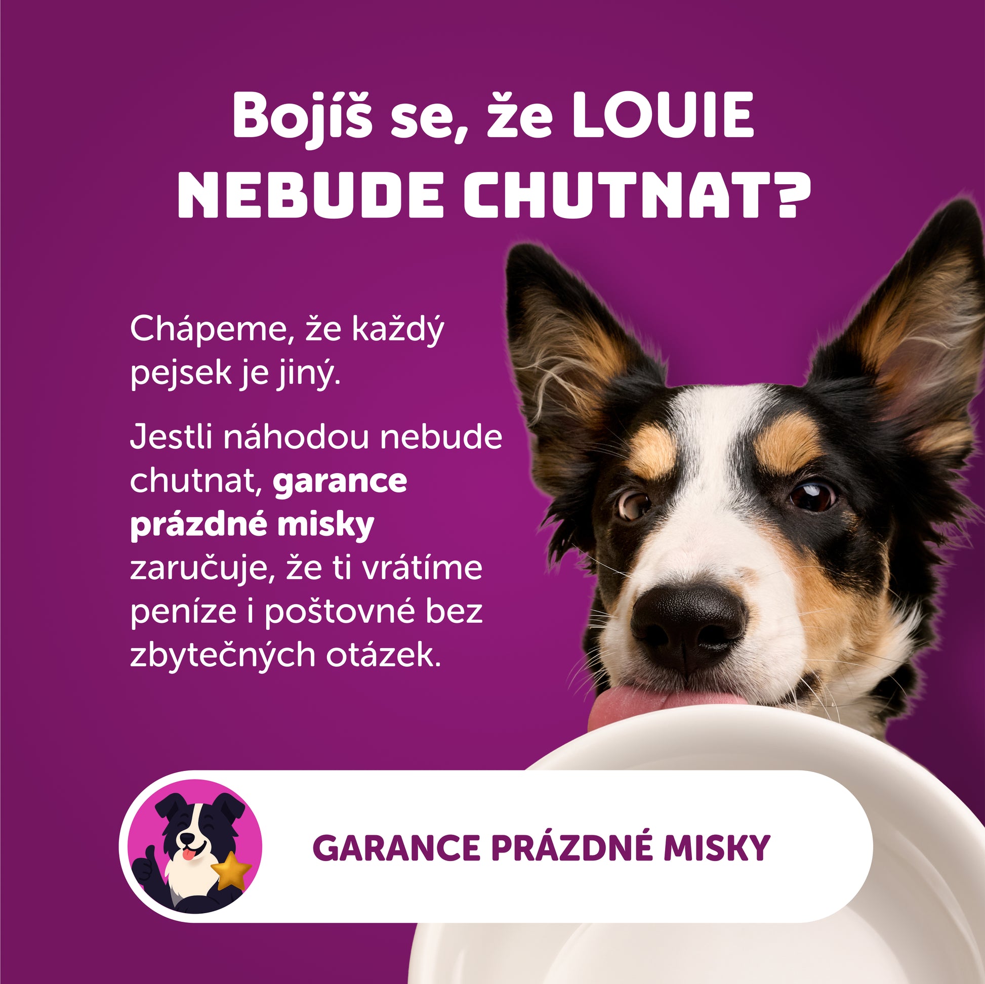 Každý pejsek má své vlastní chutě, ale konzervy LOUIE jsou připravovány z kvalitních surovin a mají přirozenou vůni i chuť, kterým většina psů neodolá. A pokud by mu konzerva opravdu nechutnala, nemusíte se bát – nabízíme Garanci prázdné misky! To znamená, že pokud pejsek krmivo odmítne, vrátíme ti peníze. Více informací najdeš zde. 😊