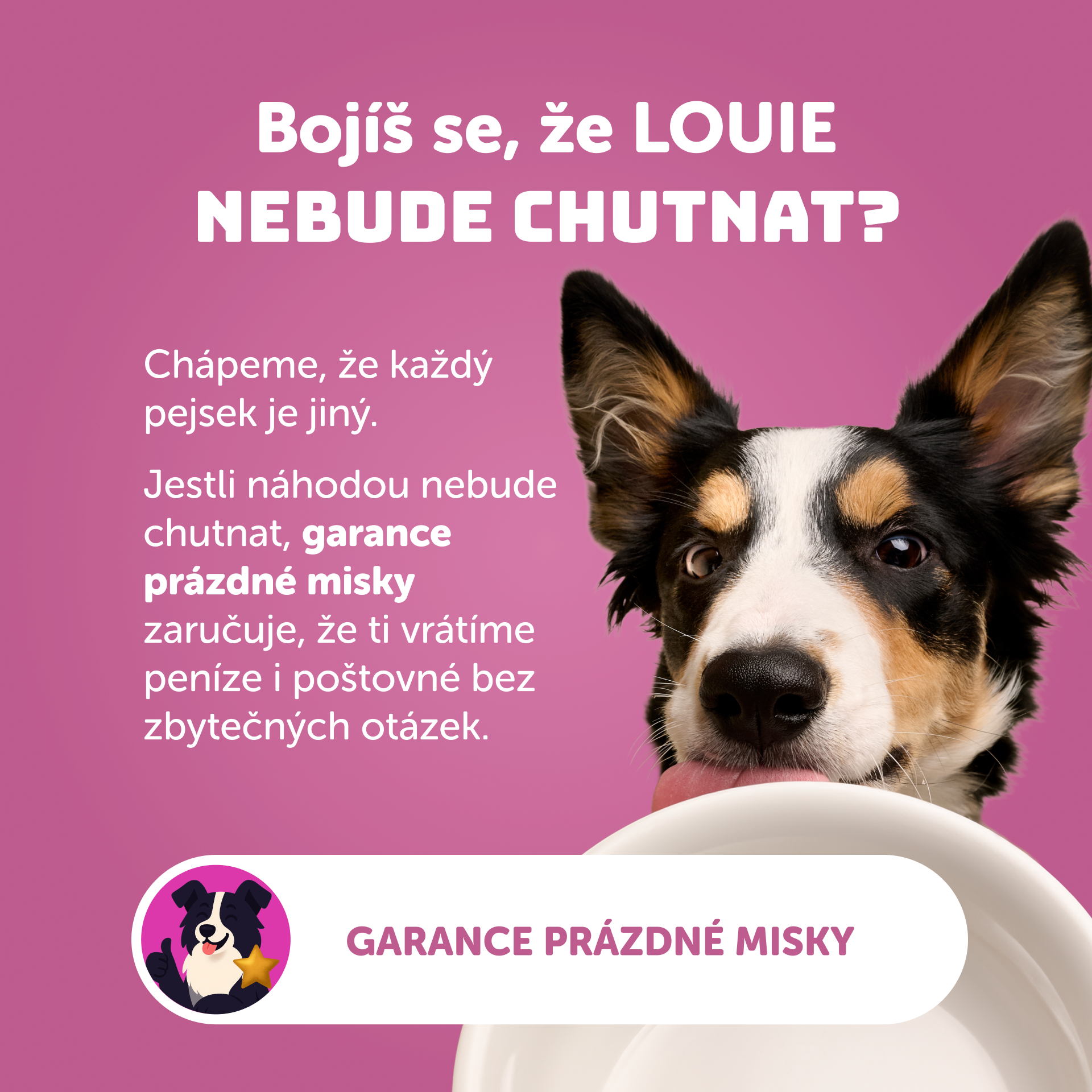 Každý pejsek má své vlastní chutě, ale konzervy LOUIE jsou připravovány z kvalitních surovin a mají přirozenou vůni i chuť, kterým většina psů neodolá. A pokud by mu konzerva opravdu nechutnala, nemusíte se bát – nabízíme Garanci prázdné misky! To znamená, že pokud pejsek krmivo odmítne, vrátíme ti peníze. Více informací najdeš zde. 😊